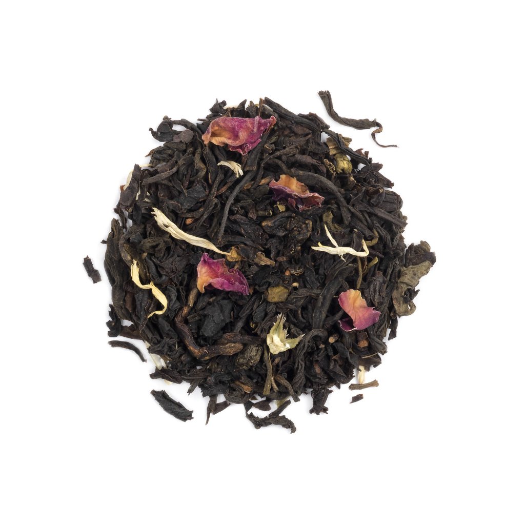 Složení: 70 % černý čaj, 29 % zelený čaj, 8 % Oolong, okvětní lístky růže, aroma bergamotu, okvětní lístky bílé chrpy.