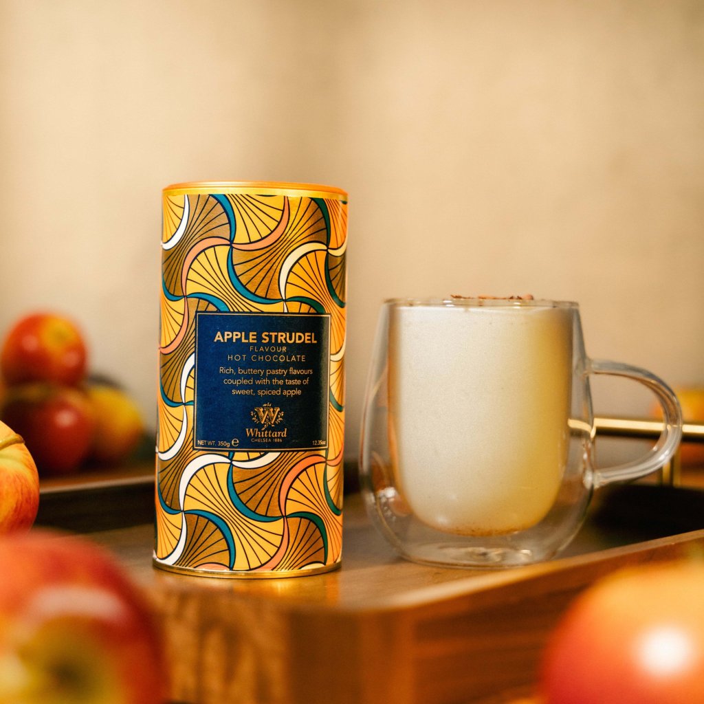 Složení: Bílá horká čokoláda s příchutí jablečného štrúdlu (cukr, 26 % kakaového másla v prášku (kakaové máslo, sušené odstředěné mléko, stabilizátor (difosfát)), syrovátkový prášek, dextróza, aroma, sůl, skořice), Luxusní mléčná horká čokoláda (cukr, 39 % kakao, dextróza, sůl, aroma), Marshmallows (glokózovo fruktózový sirup, cukr, voda, vepřová želatina, kukuřičný škrob, barvivo: kurkumin (přírodní žluté barvivo získáváno z oddenků rostliny kurkumy), barvivo karmín, aroma)