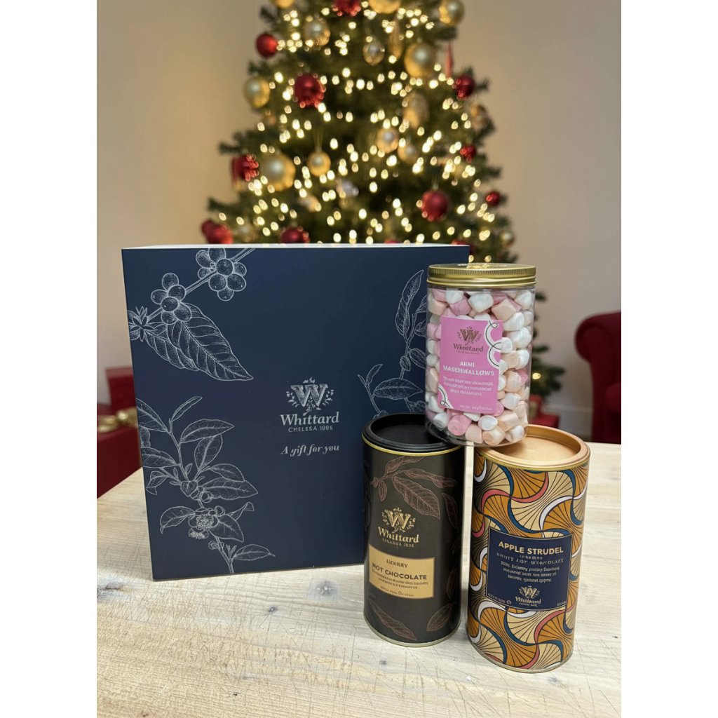 Sada obsahuje: Bílá horká čokoláda s příchutí jablečného štrúdlu, Luxusní horká čokoláda, Marshmallows dárkové balení